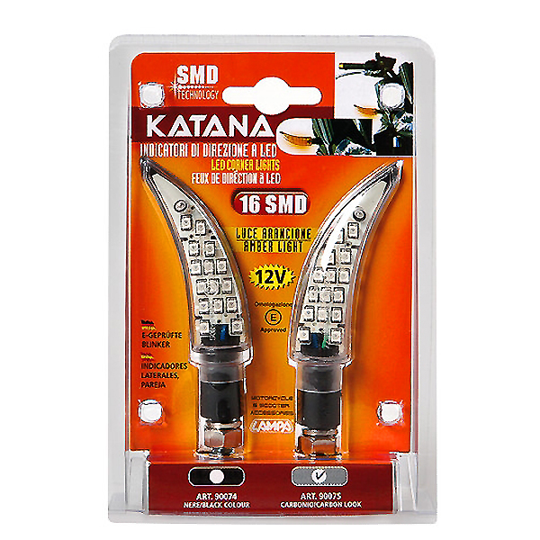 Φλας μοτο Katana 12V με 16 Led και λευκό καθρέπτη (Carbon Look). Eύκολα στην σύνδεση. Συσκευασία 2 τεμαχίων. Διαστάσεις: Mήκος 81mm. Εγκεκριμένο, Τύπου Ε.