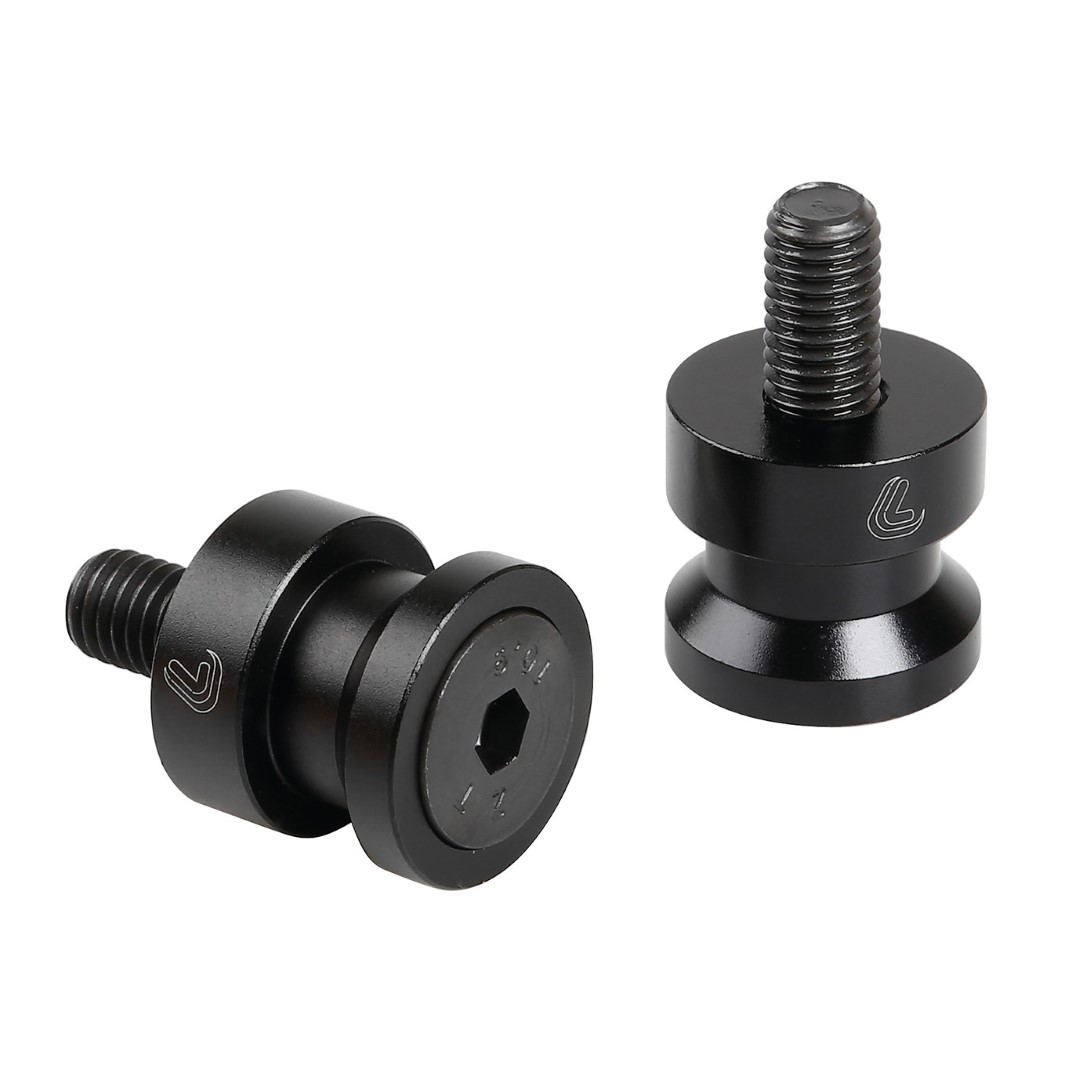 Μπομπίνες στήριξης με σπείρωμα 10 x 1,50 mm σε μαύρο χρώμα, κατασκευασμένες από υψηλής ποιότητας ανοδιωμένο αλουμίνιο για τοποθέτηση σε ειδικές οπές, που υπάρχουν στους πίσω τροχούς του οχήματος, με σκοό τη στήριξη του επάνω σε βάση/σταντ. Η ανοδίωση προσφέρει ένα λεπτό στρώμα οξείδωσης αλουμινίου, ενσωματωμένο πλήρως στην εξωτερική επιφάνεια της μπομπίνας, αναδεικνύοντας έτσι τη μεταλλική φύση του αλουμινίου και προσφέροντας σταθερότητα απόχρωσης, ανθεκτικότητα, ευκολία συντήρησης και αντοχή. Κατάλληλες για μηχανές/μοτοσυκλέτες που έχουν άνισα ψαλίδια, καθιστώντας την χρήση τους ως το μοναδικό ασφαλή τρόπο για τη στήριξη του οπίσθιου τροχού επάνω στο καβαλέτο.