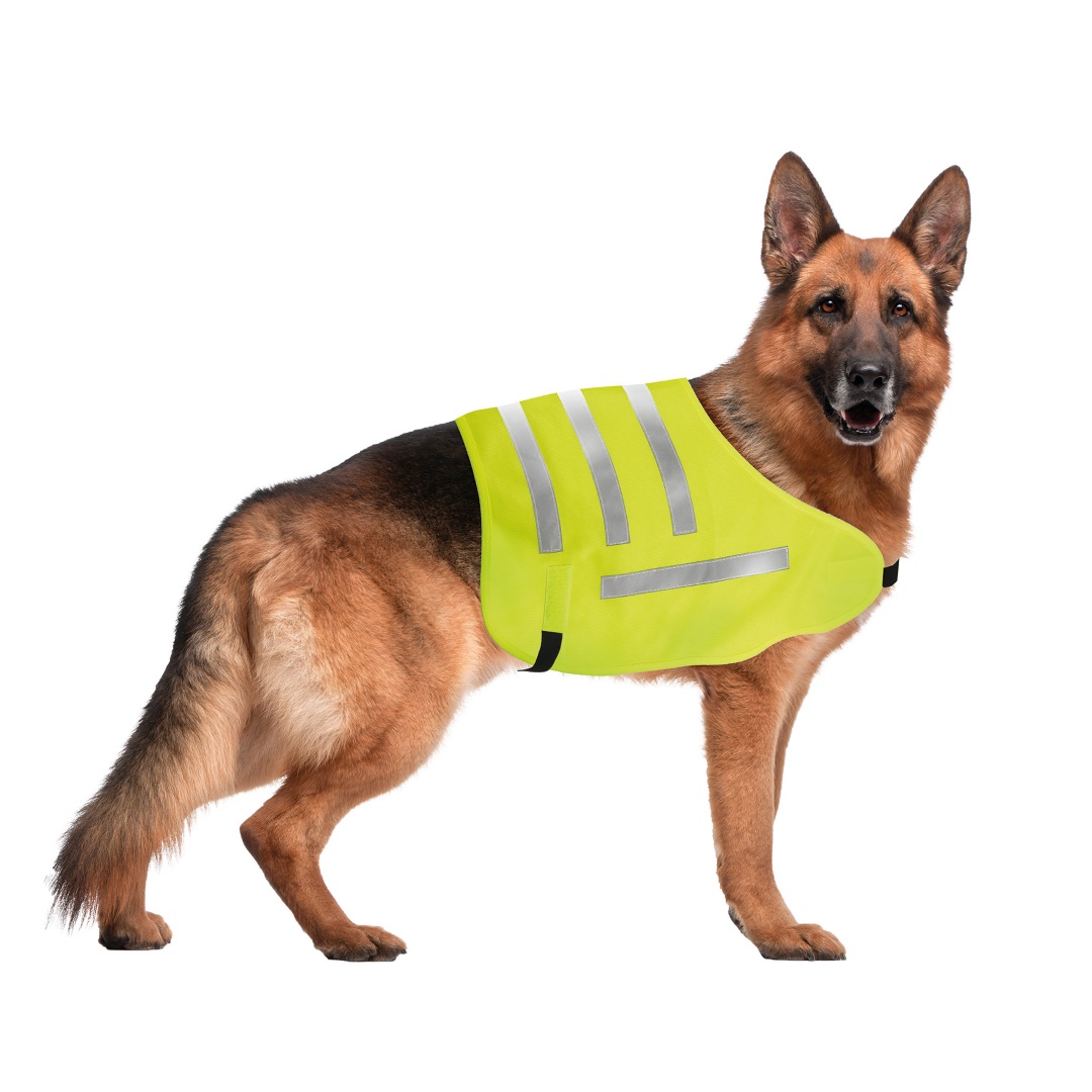 Ανακλαστικό γιλέκο ασφαλείας από την εταιρία LAMPA, ιταλικής προέλευσης, κατασκευασμένο από πολυεστερικό υλικό σε κίτρινο φωσφοριζέ χρώμα με ανακλαστικές οριζόντιες γραμμές, ρυθμιζόμενο με ιμάντες δέσης που κουμπώνουν με αυτοκόλλτα velcro, κατάλληλο για να το φοράτε στο σκύλο στη βόλτα σας, ώστε να παραμένει ορατός από διερχόμενους οδηγούς κατά την διάρκεια της ημέρας ή και της νύχτας. Ιδανική λύση για να σας συνοδεύει ο μικρός σας φίλος σε οποιαδήποτε εξόρμηση ή βόλτα με ασφάλεια και προστασία.